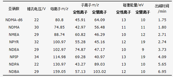 表1 N-亞硝胺的錐孔電壓、定性(量)離子、磕碰能量、出峰時刻