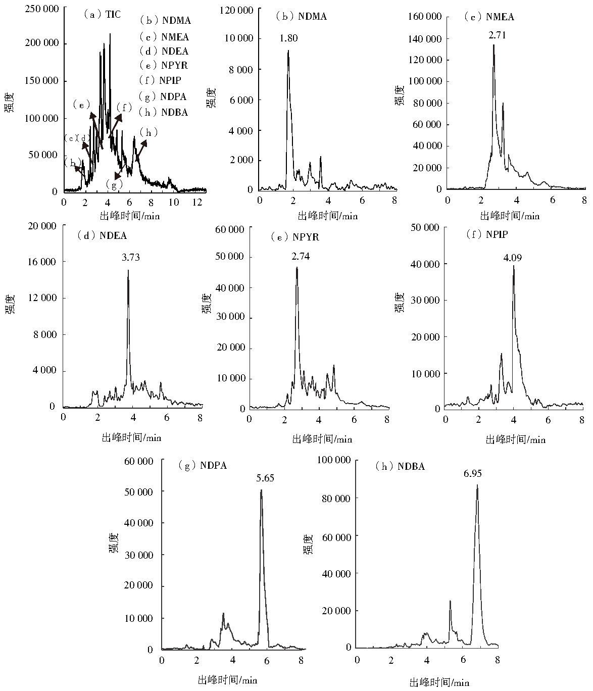7種亞硝胺類物質的剖析選用Waters(美國)出產(chǎn)的UPLC-TQD型超高效液相色譜質譜聯(lián)用儀。色譜柱為 HALO 2 C18 (2.1 mm×100 mm,2 µm),挑選甲醇為有機相,10 mmol·L−1(pH為8.0左右)的碳酸氫銨為無機相,活動相流速為0.2 mL·min−1,進樣體積為10 µL,柱溫文樣品室溫度分別為40 ℃和25 ℃。選用梯度洗脫的辦法對所測物質進行別離,活動相梯度改動為:0.2→3.00 min,5%→40%(甲醇);3.00→6.00,40%→60%(甲醇);6.00→8.50 min,60%→100%(甲醇);8.50→11.00 min,100%→5%(甲醇);5%的甲醇堅持2 min,總運轉時刻為13 min。運轉儀器進行測守時選用MRM(多通道監(jiān)測)形式,得到TIC(總離子流圖)和7種亞硝胺類物質的色譜提取圖。