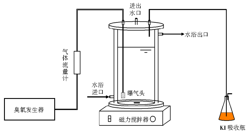 臭氧氧化試驗設備如圖1所示。該設備主體反響器有用體積為4.5 L,臭氧發(fā)生器(廣州佳環(huán)電器科技有限公司,HY-006-2CA)出口流量通過氣體流量計調理操控在60 L·h−1,未反響的氣體通入20% KI溶液進行吸收。整個反響設備通過水浴調理使得反響溫度操控在20 ℃,該臭氧氧化體系通過調理不同的反響時刻來操控臭氧投加量,整個反響進程在通風櫥內進行。